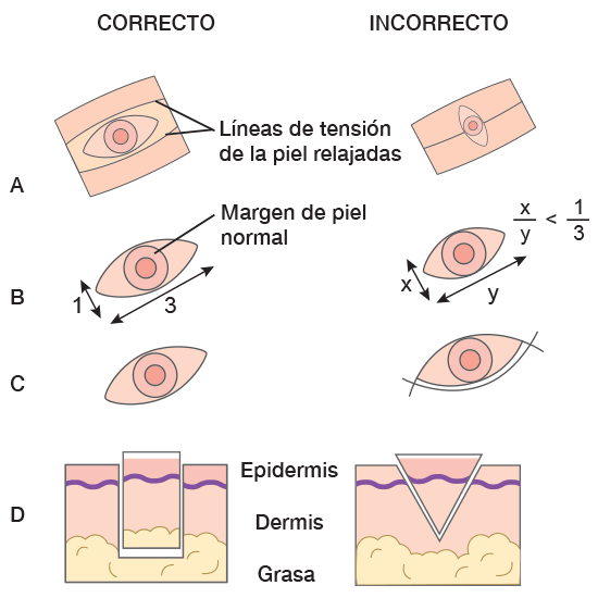 1. Biopsia por afeitado: Biopsia de piel superficial con hoja #10 o #15. Útil para lesiones elevadas (ej. nevo compuesto benigno). Sin sutura. Hemostasia con solución de Monsel’s, cloruro de aluminio, o electrodesecación. 2. Biopsia en sacabocado: Se obtiene el espécimen con una pinza sacabocados. Usualmente se toman de 3 a 5 mm y se necesitan 1 o 2 puntos de sutura. 3. Biopsia incisional (“cuña”): Remoción elíptica parcial de una leisón hasta la grasa. Útil, por ejemplo, cuando una neoplasia maligna es muy grande para resecar por cirugía simple, en la esclerodermia, paniculitis y pioderma gangrenoso. Requiere cierre por sutura en capas. 4. Biopsia escisional: Remoción elíptica completa de la lesión hasta la grasa. Útil en la resección completa de cáncer de piel. Requiere el cierre por capas con suturas. 5. Curetaje: Para lesiones hiperqueratósicas (ej. queratosis seborreica, verrugas, carcinoma basocelular); con frecuencia acompañada por cauterización. 6. Sección (tijeras): papilomas cutáneos, verrugas filiformes