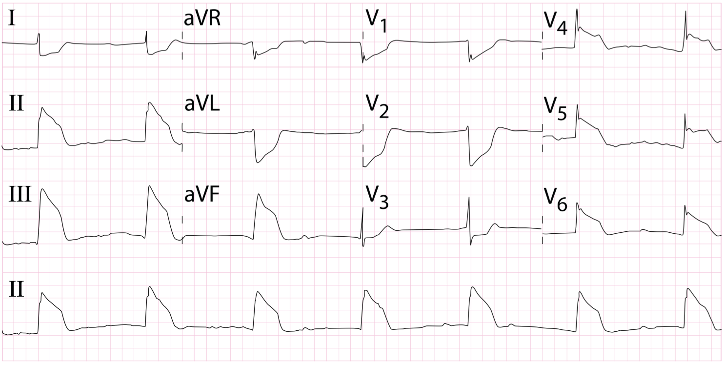 Paciente varón de 60 años de edad ingresado por presíncopes y síncopes de repetición de perfil vasovagal (palidez, diaforesis, náuseas) pero asociados, en ocasiones, a dolor torácico. Durante la hospitalización sufre un nuevo episodio y se realiza el siguiente electrocardiograma. Al cabo de 2 minutos, el paciente ya está consciente.