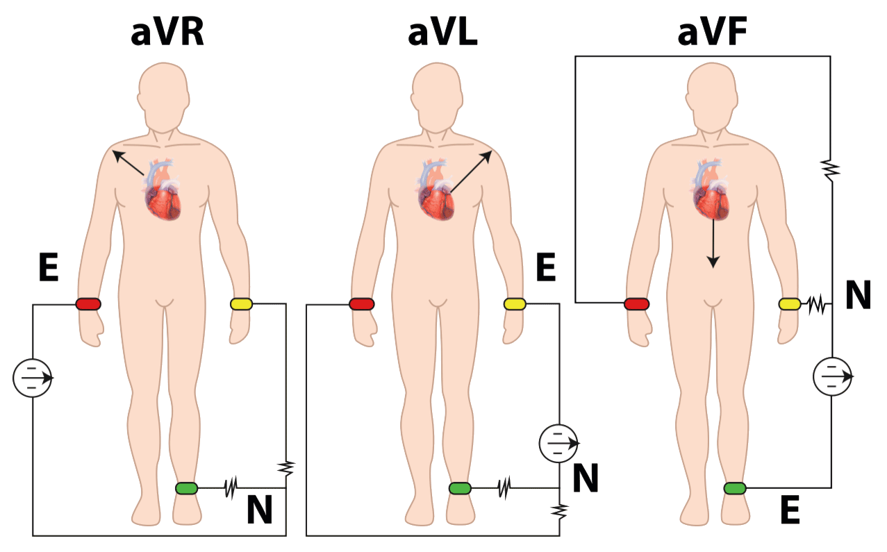 Se utilizan 12 derivaciones electrocardiográficas, denominadas DI, DII, DIII, aVR, aVL, aVF, V1, V2, V3, V4, V5 y V6. Estas derivaciones pueden ser monopolares o bipolares. Las derivaciones de las extremidades son I, II, III (bipolares, generadas al comparar un electrodo con otro), aVR, aVL y aVF (generadas mediante un electrodo y el centro del corazón), que se obtienen de cuatro electrodos conectados a cuatro cables en extremidades superiores e inferiores. Las derivaciones aVR, aVL y aVF son conocidas como monopolares porque en ellas solo interviene un electrodo. Las siguientes seis derivaciones son las derivaciones precordiales o del plano horizontal, identificadas como V1, V2, V3, V4, V5 y V6, que observan la actividad eléctrica del corazón desde el punto de colocación de cada electrodo mirando hacia el centro del corazón. Las figuras muestran la localización específica de los electrodos requeridos para medir estas derivaciones. Las derivaciones bipolares registran la diferencia de potencial: DI, entre el brazo derecho y el brazo izquierdo; DII, entre el brazo derecho y la pierna izquierda; DIII, entre el brazo izquierdo y la pierna izquierda.