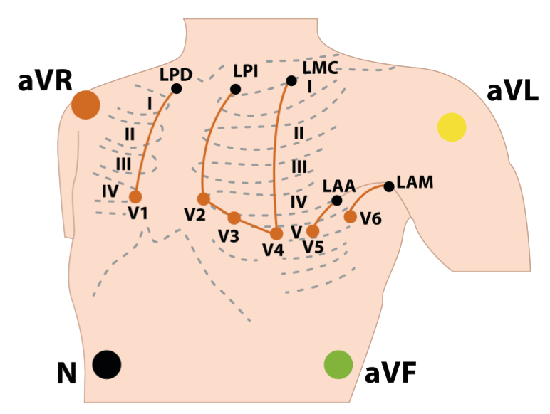 Colocación correcta de los 10 electrodos necesarios para un electrocardiograma de 12 derivaciones (4 para derivaciones frontales, 6 para derivaciones horizontales o precordiales). El electrodo “N”, sirve como toma a tierra, para evitar alteraciones en el registro de los demás. Este electrodo se coloca en la pierna derecha.