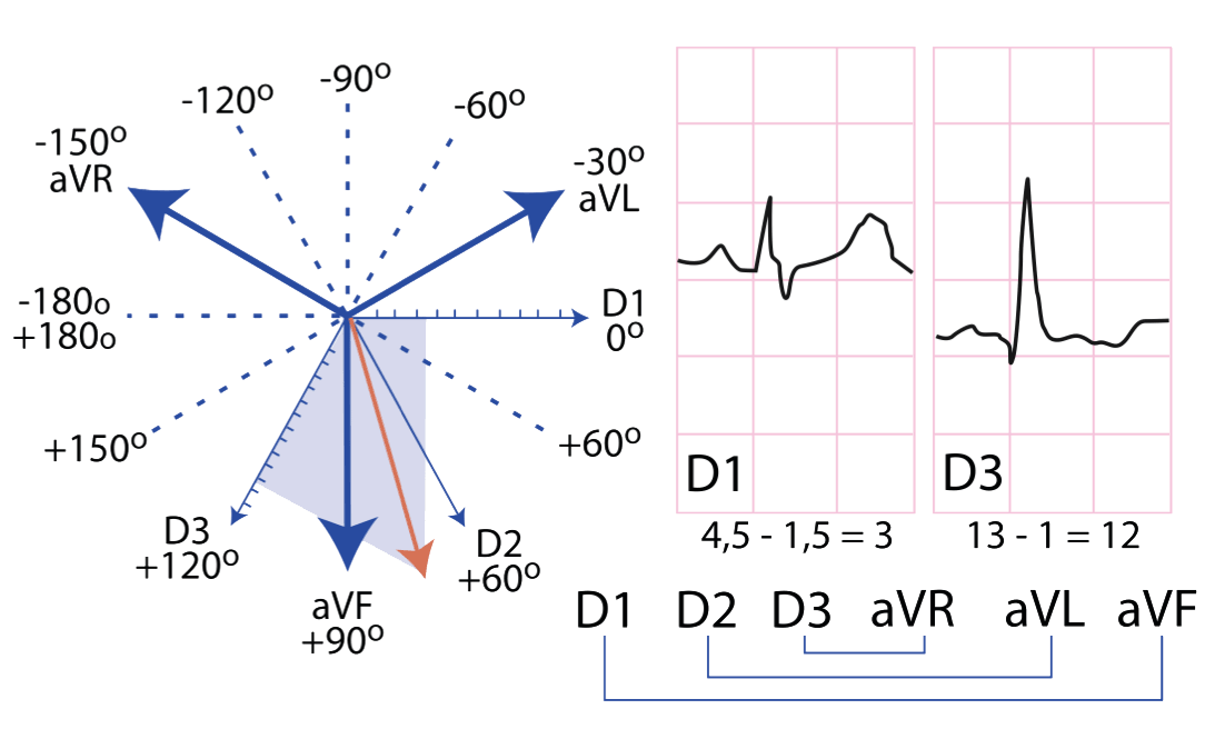 El eje cardiaco, o por su nombre, el eje eléctrico del complejo QRS, no es más que la dirección del vector total de la despolarización de los ventrículos. Es decir que el eje cardiaco es la dirección principal del estímulo eléctrico a su paso por los ventrículos. El Sistema hexaxial de Bayley es ampliamente utilizado en el campo de la electrocardiografía y la cardiología. Permite una representación visual clara y precisa de la dirección de la corriente eléctrica del corazón en el plano frontal, lo que facilita la interpretación del ECG y la identificación de posibles anomalías eléctricas. En la figura se puede observar el sistema hexaxial que funciona como una representación gráfica de todos los vectores formados en las respectivas derivaciones frontales. Por ejemplo, aVF cumple la función de eje vertical de nuestro plano cartesiano. Mientras que D1 cumple la función de eje horizontal. Cada derivación tiene dos posibles grados de dirección. Por ejemplo, se puede ver como D1 en polaridad positiva tiene un vector con 0 grados. Mientras que en polaridad negativa tiene un vector con 180 grados. Se pueden determinar por separado los ejes de las ondas P, la onda T y el complejo QRS. El eje eléctrico del corazón debe estar normalmente entre 0° y 90°. La intersección de ambas perpendiculares a D1 y D 3 determinan el eje eléctrico QRS. En este caso se encuentra a 80° aproximadamente.