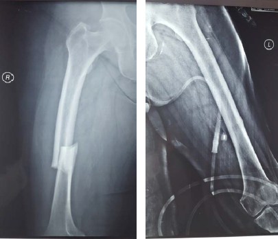 intra-medullary nailing of the right femur and conservative treatment of the left side. Uneventful union occurred on both sides.
