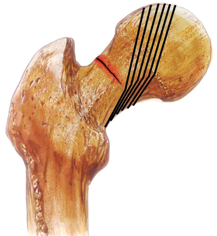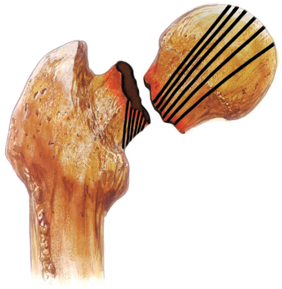La cabeza femoral se inclina hacia una posición en varo, y el patrón trabecular de la cabeza del fémur no está alineado con el del acetábulo.