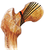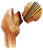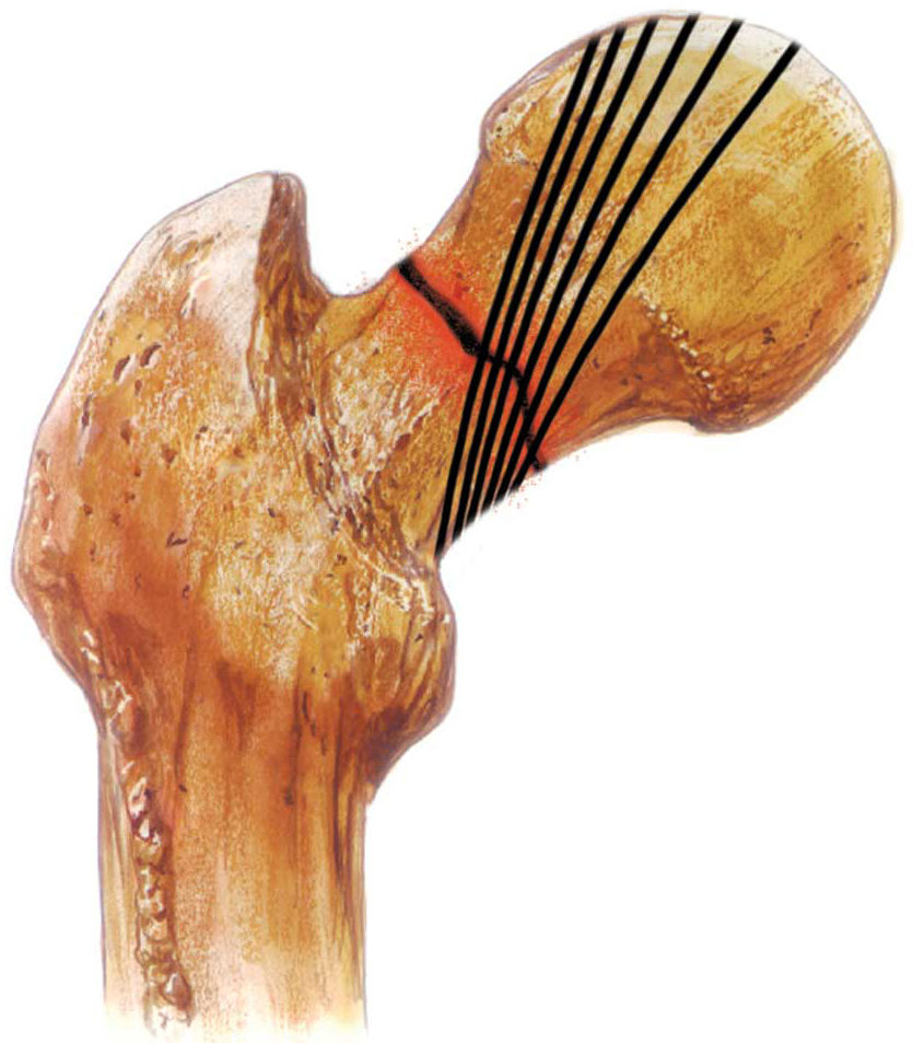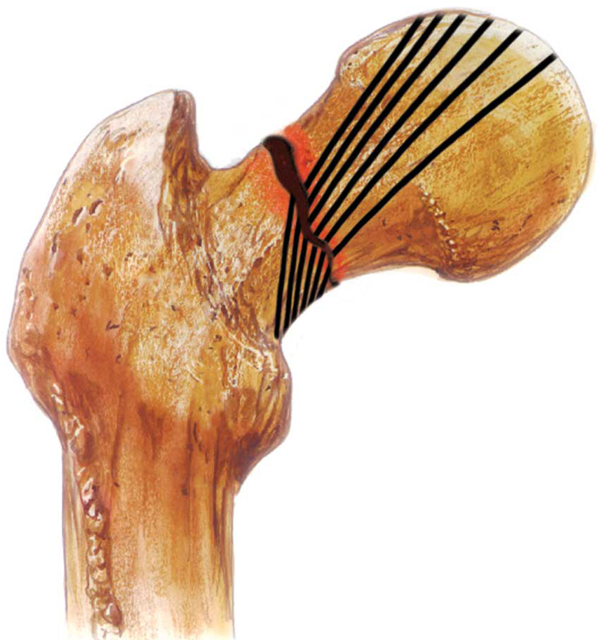El patrón trabecular de la cabeza femoral está orientado en su posición normal con el del acetábulo.